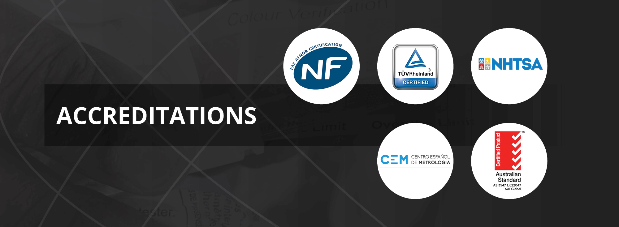 Additional certifications include Chemistry Centre Perth, ESR Laboratories Auckland, Touring Club of Switzerland, Austrian and French Automobile Clubs, French Securite Routiere and Prevention Routiere, Swiss Council for Accident Prevention, and Inmetro test for chemical screening tests, Brazil.