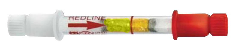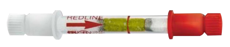 LUMO Self-test Breathalyser is a compact, 70mm glass tube containing yellow chemicals that turn green in the presence of alcohol. The green colour’s length indicates the amount of alcohol. The tube includes an arrow for breath direction and a red calibration line for the legal driving limit. It features white crystals at both ends, sealed with plastic snap-off caps, and a plastic bag equipped with a neck valve to measure breath volume.